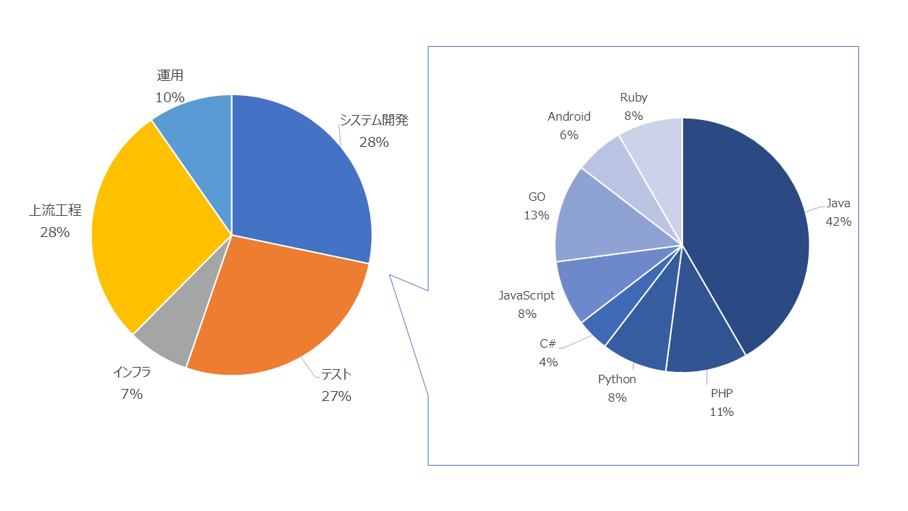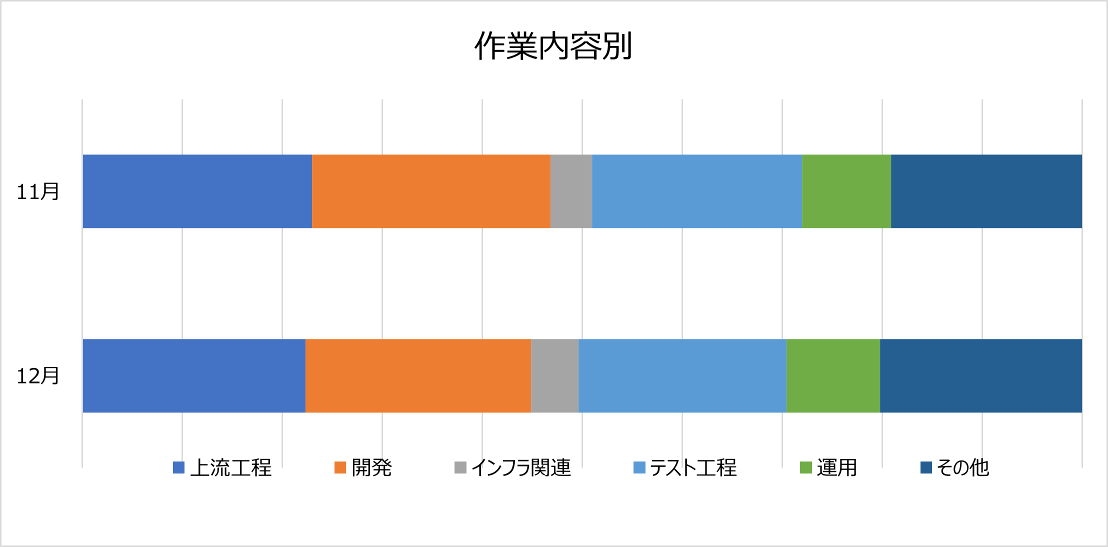 作業内容別に見ると、インフラ関連と運用が若干増えています。