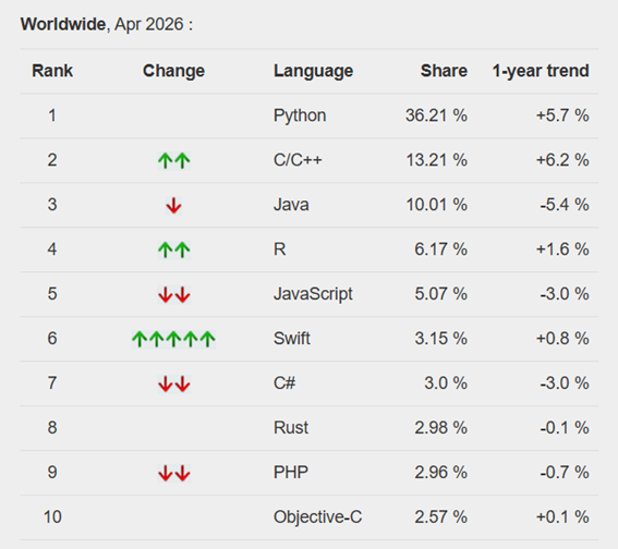 まず初めに、世界のプログラミング言語トレンドを確認してみましょう。こちらはソフトウェアコードの品質を測定しているオランダの企業TIOBEが発表している開発言語の人気動向を示す指標(2025年及び2026年)を基にした、世界のプログラミング言語ランキングになります。